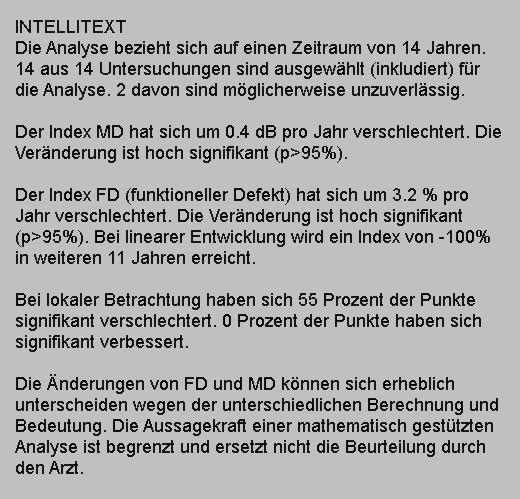 Beim Intellitext wird aus dem Ergebnis der statistischen Trend-Analyse ein verständlicher Text generiert, der wichtige Resultate zusammenfaßt (Details zum Rechenverfahren). Dazu gibt er Hinweise auf Qualitätsmängel.