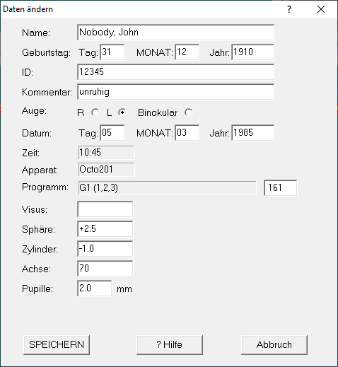 Auge: Wenn bei der Untersuchung das Auge falsch eingegeben wurde, kann es nachträglich korrigiert werden. Andere Folgen dieser Verwechslung werden nicht beseitigt, z.B. unsinnige Werte bei der Fixationskontrolle, weil der blinde Fleck auf der falschen Seite gesucht wurde.