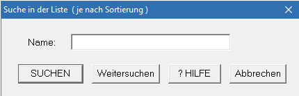 SUCHEN findet den ersten Treffer ab dem Anfang der Liste. Der rote Balken springt auf den Treffer. Das Suchfenster schließt sich. Falls es keinen Treffer gibt, bleibt das Suchfenster offen, der Suchbegriff kann geändert werden.
