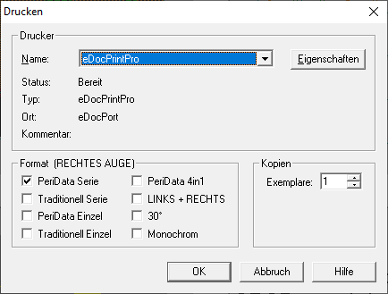 Für Arztbriefe und ähnliches hat PeriData eine umfangreiche Druckfunktion. Der Druck erfolgt aus einem aktiven Gesichtsfeld-Fenster (Serie, Einzel, Links-Rechts oder Trend). Gedruckt werden die aktuell gezeigten Gesichtsfelder, also beispielsweise beim Druck im Links-Rechts-Fenster ein linkes und rechtes GF. Die BILD-Arten auf dem Druck werden über ein Druck-Format gewählt, die aktuelle Bild-Darstellung auf dem Monitor hat keinen Einfluss.