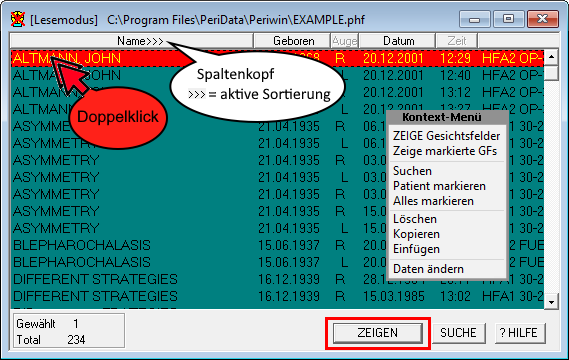 Button "ZEIGEN" ENTER - Taste Doppelklick: alle Untersuchungen des angeklickten Patienten werden automatisch gewählt und die Darstellungsfenster mit den Gesichtsfeldern öffnen sich